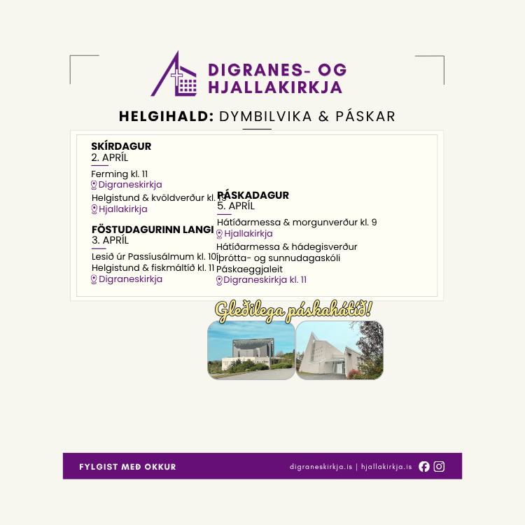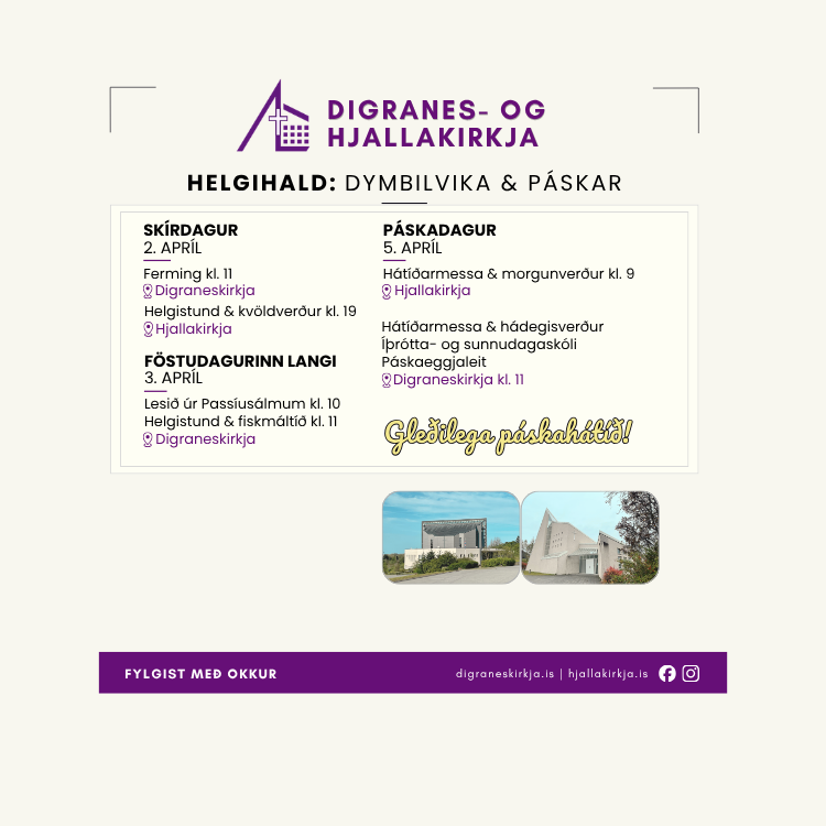Helgihald bænadaga og páska Fimmtudagur 2. apríl - Skírdagur Digraneskirkja ▪️ Fermingarmessa kl. 11 Kvartett úr Hljóðfalli, kór Digraness- og Hjallakirkju syngur undir stjórn Helgu Margrétar, organisti er Kristján Hrannar, prestar eru Alfreð og Hildur. Hjallakirkja ▪️ Borðhald og messa