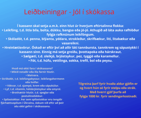 Þau sem vilja, geta komið með skókassana sína fullbúna til okkar og skilað þeim, en þeir sem vilja frekar, geta undirbúið kassana hjá okkur. Við getum útvegað skókassa og jólapappír. Skókassarnir eru fyrir börn á aldrinum 3-6 ára, 7-10 ára 11-14 ára eða 15 -18 ára. Ákveða þarf hvort þið viljið senda stelpu eða strák.