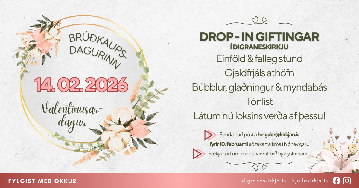 Laugardaginn 14. febrúar ætlum við í Digranes- og Hjallakirkju að bjóða upp á „drop-in“ giftingar.