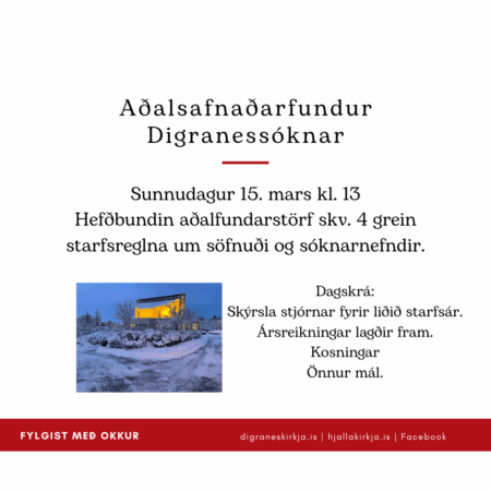 Sunnudaginn 15. mars 2026 er boðað til aðalsafnaðarfundar Digranessóknar.